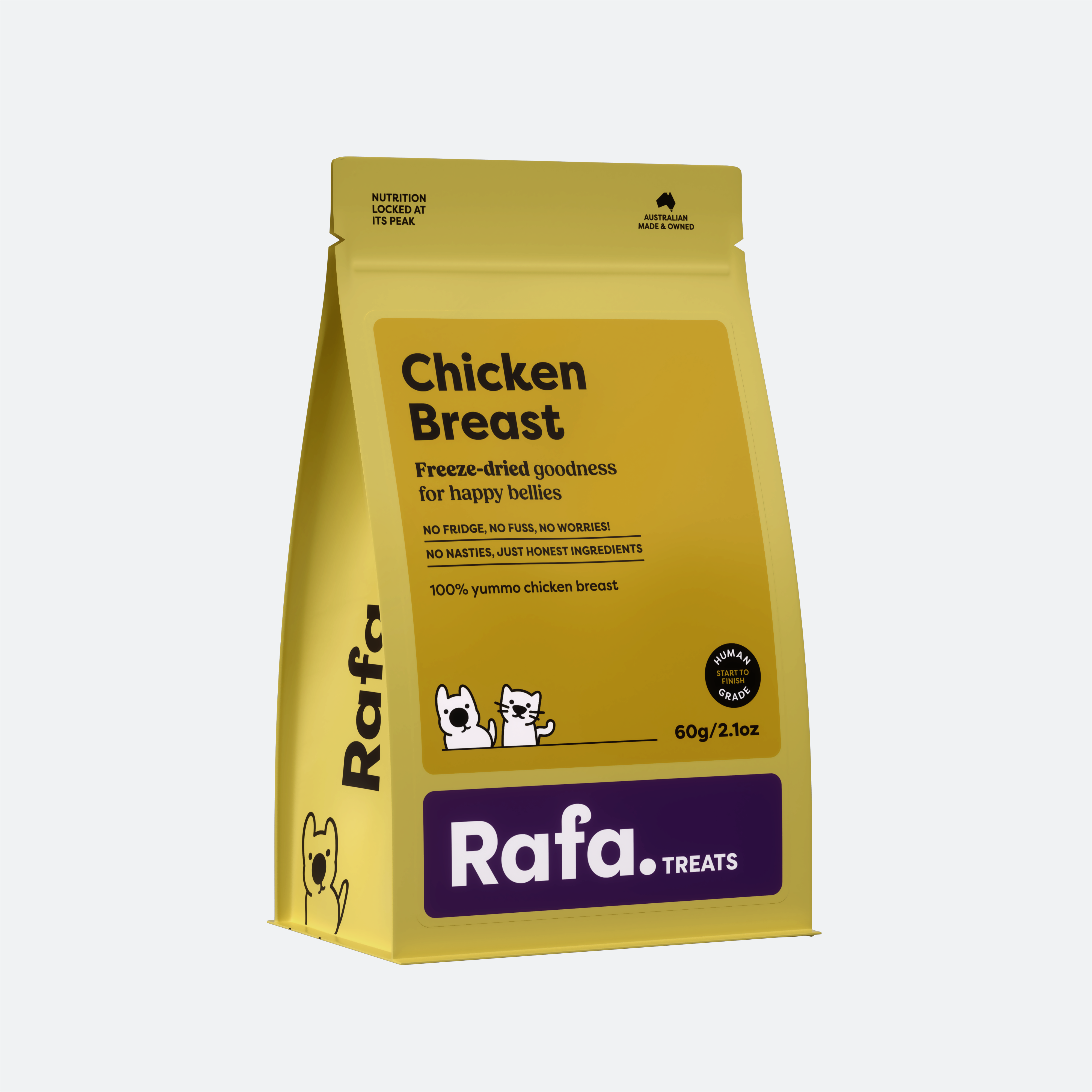 At Rafa, there are no shortcuts. We don’t use wheat, corn, soy, glycerin, or synthetic preservatives — and we never will. Every treat is simply real meat or seafood, freeze-dried to naturally preserve nutrients and shelf life, without the need for anything artificial.